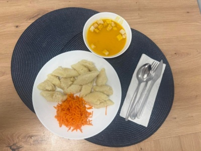 Kopytka(1, 2, 3) z masełkiem (300g), surówka z marchewki (100g) i selera, zupa krem z dyni z grzankami(2).