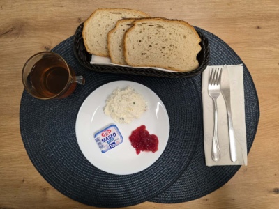 Twaróg(100g, 3) z rzodkiewką i szczypiorkiem, dżem niskosłodzony, masło(10g, 3), pieczywo mieszane(110g, 2), herbata(250ml).