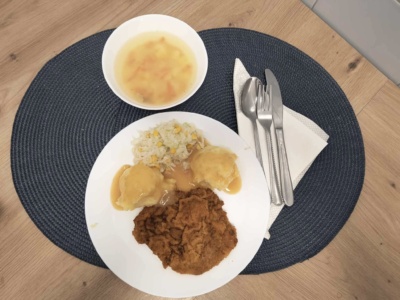 Kotlet schabowy(1, 2) (100g), ziemniaki (200g) dukane z koperkiem, surówka z kapusty białej i kukurydzy (100g), zupa krupnik z kaszą jaglaną.