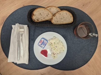 Sałatka z kaszą bulgur(2)(100g), jajko(1) gotowane, wędlina(80g), masło(10g, 3), pieczywo mieszane(110g, 2), herbata(250ml).