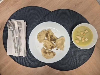 Pierogi(1, 2, 3) ruskie z okrasą, zupa krem z zielonego groszku(3, 4) z grzankami(2)